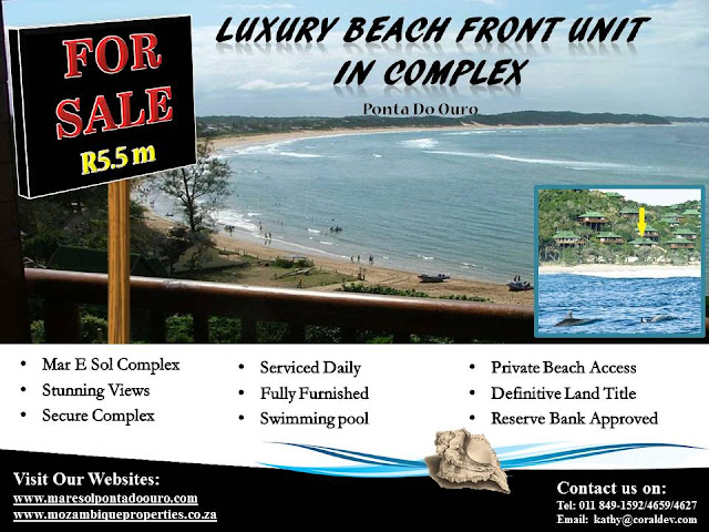 Located just 1 hour from Maputo, 6 hours from Johannesburg and 4 hours from Durban the Mar e Sol Tourism and Condominium Development offers both guests and speculators alike a magnificent opportunity to both enjoy the relaxing spectacular vistas plus invest into a long term stable venture that offers impressive returns and passive income through rentals if so required. Central and Reserve Bank approvals plus full rights afford investors perpetual stability and guaranteed returns on resales.